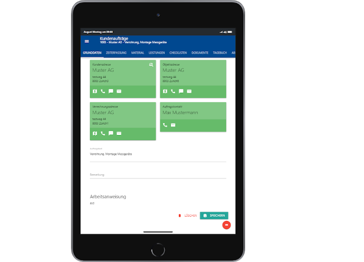 Alle wichtigen Informationen wie Arbeitszeiten, verwendete Materialien und Kundenunterschriften werden digital und strukturiert erfasst. So gehen keine Daten mehr verloren, Missverständnisse werden vermieden und die gesamte Dokumentation bleibt jederzeit nachvollziehbar.